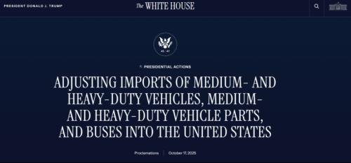 据路透社报道,10月17日,美国总统特朗普签署行政令,扩大美国汽车及发动机生产相关抵免范围,并从11月1日起对进口中型和重型卡车及零部件征收25%的新关税。