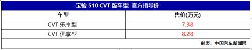 中国汽车新闻网讯7月18日,上汽通用五菱官方正式发布宝骏510 CVT版车型正式上市,此次上市共推出两款车型,售价区间为7.38-8.28万元。新款车型最大的变化主要是匹配了CVT无级变速箱。