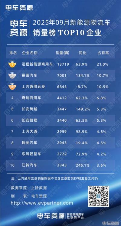 从整体数据来看,2025年1-9月新能源物流车行业呈现两大趋势:一是头部集中度持续提升,TOP3企业中,远程、福田汽车、上汽通用五菱合计占比达40.7%,接近行业半壁江山;二是市场增长动力多元,既有以旧换新补贴等政策驱动,也有龙头企业的稳健拉动,中部企业的破局式增长。