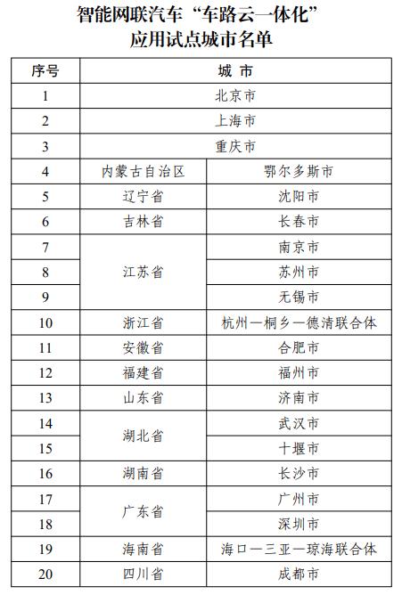 2024年7月1日,工业和信息化部等五部门联合公布了首批智能网联汽车“车路云一体化”应用试点城市名单,共涵盖20个城市(联合体),具体名单如下: