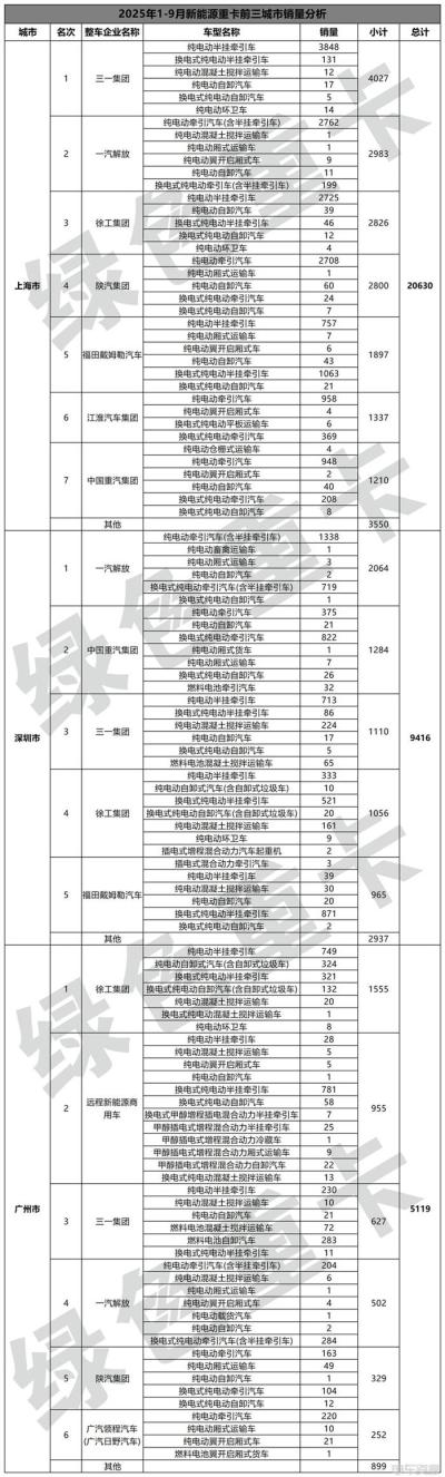 上海市销量达20630辆,成为唯一销量超20000辆的省级区域。沪粤川三省市新能源重卡销量高达47730辆,占1-9月新能源重卡总销量的34.41%。