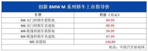 同时,上市的还有M4双门轿跑车和M4敞篷轿跑车,售价86.99-97.99万元;以及M5雷霆版,售价146.89万元。