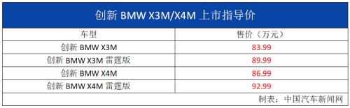 中国汽车新闻网讯8月27日,创新宝马X3M、X4M正式上市。新车共推出4款配置车型,售价83.99-92.99万元。相比X3、X4,这两款M版车型增加了M系专属套件设计,且运动性能更强。两款新车将搭载全新的S58系列3.0升双涡轮增压直列六缸发动机,雷霆版的最大功率高达510马力。