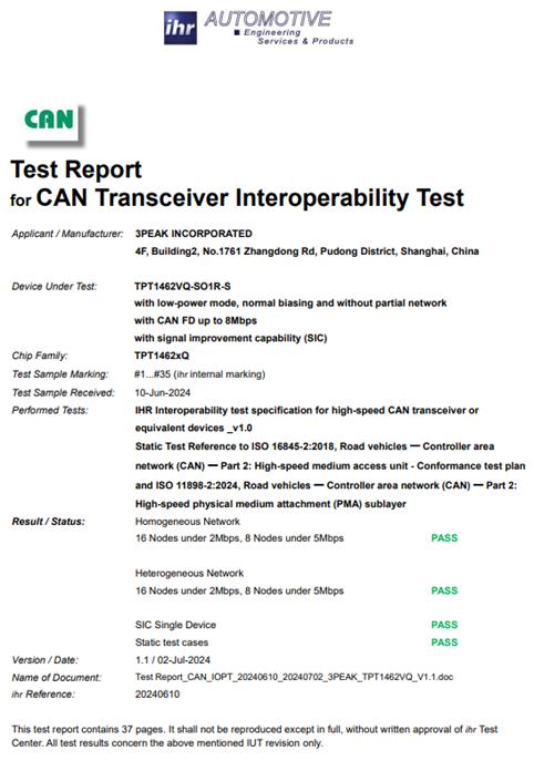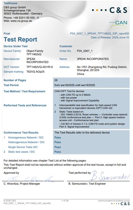TPT1462xQ通过C&S互联互通一致性与兼容性测试(IOPT测试),意味着其具备与整车CAN总线上下游设备(控制器、传感器、执行器等)的无缝对接能力,可与其他C&S认证CAN收发器无障碍通信,无需车企投入大量资源做整车兼容性测试,既缩短车型研发周期,为CAN总线通信稳定性提供国际权威保障。