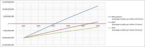 ●如果每个换电站每天换电次数只有50次,累计的净现值减少为负2.65亿元(见图2“绿色曲线”);