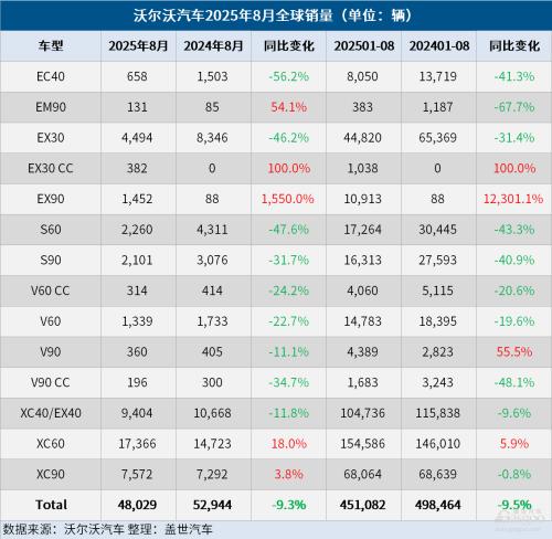 且值得注意的是,今年8月份,XC60是沃尔沃最畅销的车型,销量达17,366辆(2024年同期的销量为14,723辆);紧随其后的是沃尔沃XC40/EX40,销量为9,404辆(2024年同期的销量为10,668辆);沃尔沃XC90则以7,572辆的销量位居第三(2024年同期的销量为7,292辆)。
