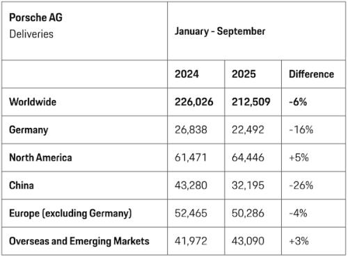 尽管利润大幅下滑,保时捷的销量和营收跌幅却相对平缓。2025年前三季度,其全球交付21.25万台,同比下滑6%;营业收入约为268.6亿欧元,同比同样下降6%。
