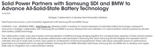 据外媒报道,美国固态电池技术开发商Solid Power宣布,其将与三星SDI、宝马开展新的合作,以共同开发全固态电池(ASSB)技术,并验证搭载该技术的示范车辆性能。
