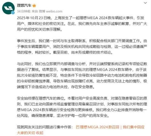 八天后,理想汽车官方发布致歉声明并宣布主动召回11411辆同批次MEGA车辆。创始人李想表态:“事故可能是万分之一,但是生命只有一次,是百分之百。”