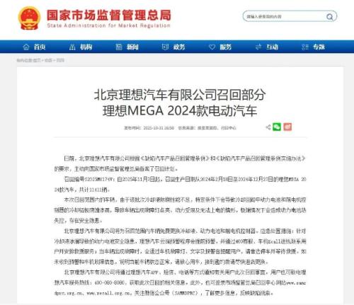 根据国家市场监督管理总局的召回公告,理想汽车将自2025年11月7日起,主动召回生产日期从2024年2月18日至2024年12月27日的理想MEGA 2024款汽车,共计11411辆。召回编号为S2025M0174V。