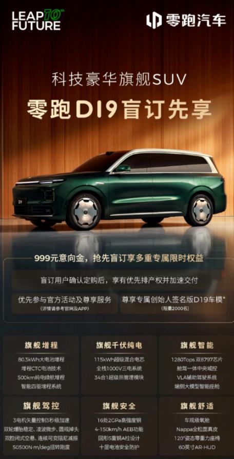 11月1日,零跑宣布品牌旗舰SUV,零跑D19正式开启盲订,支付999元意向金可享优先排产、限量2000份创始人签名D19车模及后续活动优先参与权+尊享服务在内的多项权益。