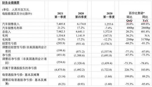 4月30日,蔚来发布了2021年第一季度财报,多项指标创历史新高。蔚来一季度营收79.8亿元人民币,同比增长481.8%;汽车毛利率21.2%,相比之下,2020年第一季度为负7.4%,上季度为17.2%。