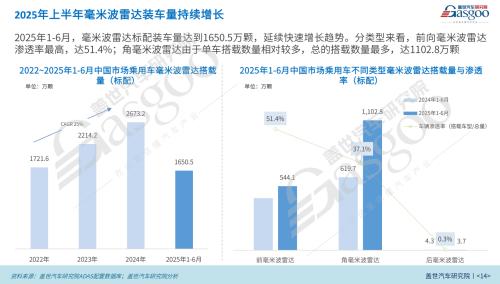据盖世汽车研究院数据,2025年上半年,中国市场乘用车毫米波雷达标配装车量达到1650.5万颗,延续快速增长趋势。分类型来看,前向毫米波雷达渗透率最高,达51.4%;角毫米波雷达由于单车搭载数量相对较多,总的搭载数量最多,达1102.8万颗。