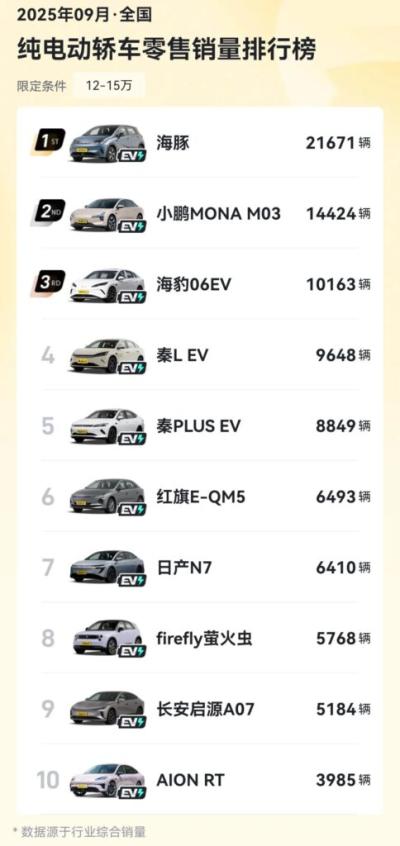 同样以9月份的数据来看,我们把对比项选择到和日产N7一样,即售价在12万-15万元价格带的纯电轿车,基本上月销4000辆就能进入到十强中来。