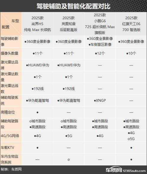 驾驶辅助方面,尚界H5和岚图知音均采用华为乾崑智驾系统,搭载11个摄像头以及1个激光雷达,支持高速路段辅助驾驶,而城市路段则需要通过选装才能得到。小鹏G6采用纯视觉解决方案,支持高速路段以及城市路段的辅助驾驶。此外,红旗天工06也支持两种路段的辅助驾驶。