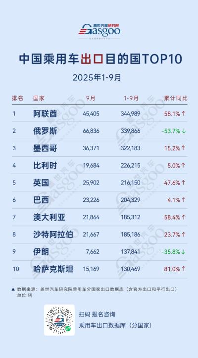 第五位,阿联酋。9月,向阿联酋出口20,375辆,1-9月累计89,948辆,同比增加66.9%。
