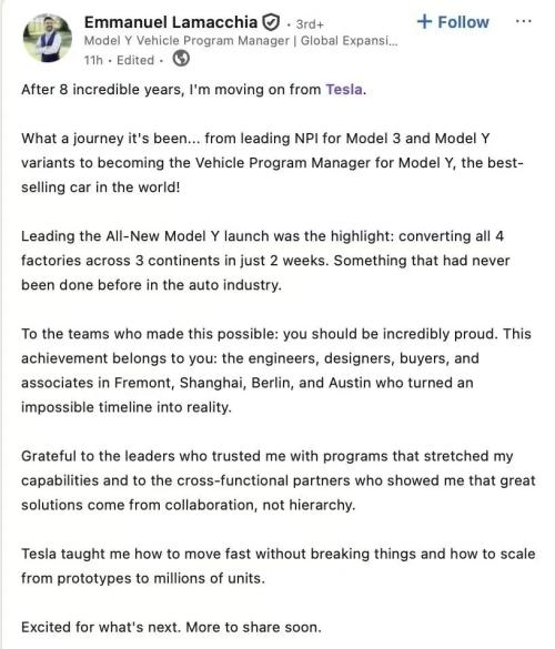 在阿瓦斯蒂宣布离开公司的几小时后,畅销车型Model Y的项目经理伊曼纽尔*拉马奇亚Emmanuel Lamacchia也对外正式宣布离开特斯拉。