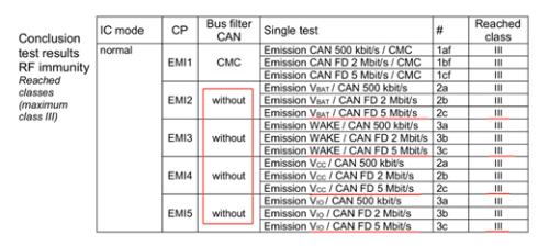 IBEE/FTZ-Zwickau认证以IEC62228-3标准为依据,其测试体系直接聚焦芯片本身的EMC原生性能,同时在抗干扰功率、瞬态防护等关键指标上设置更高阈值,能更真实、严格地验证芯片在复杂车载环境下的稳定性。该认证涵盖四大核心测试维度,全面覆盖车载场景下的电磁干扰风险,而思瑞浦TPT1043AQ凭借优异的硬件设计,实现无特殊条件备注、全测试向量通过Class-3最高等级,具体测试表现如下表:
