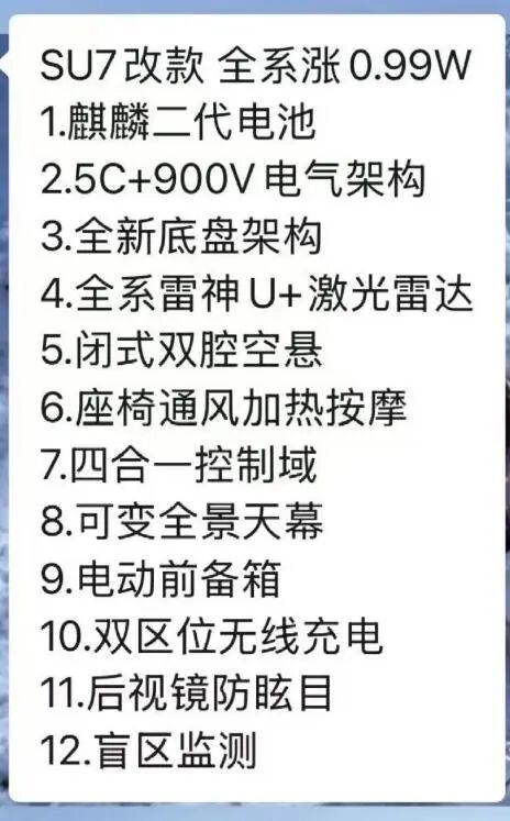 虽然新车价格可能要上涨,但是配置也升级了不少。据博主爆料,SU7改款相比现款车型有12项升级。