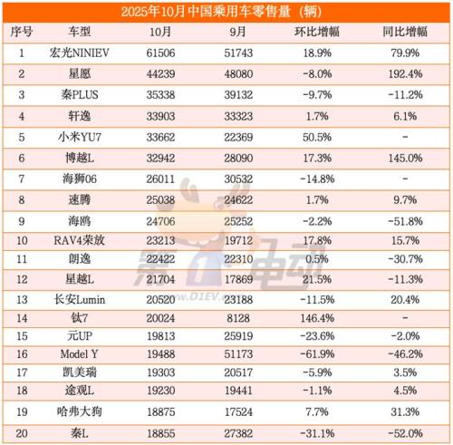 传统燃油车则面临市场分化压力,20强中12款燃油车型表现参差不齐:名爵系列分化明显,名爵ZS以16410辆位列第四,但环比下降3.9%、同比下滑16.1%,名爵HS却迎来70.4%的环比激增;出口老牌奇瑞瑞虎系列,瑞虎5X同比增长33.7%,但瑞虎7、瑞虎8分别同比下滑58.4%、37.2%,反映出传统燃油车在新能源替代压力下的转型阵痛。