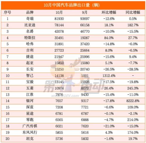 值得关注的是,特斯拉10月出口量达3.5万辆,环比大涨84%,创两年来单月新高。智己出口量超1.4万辆,环比实现超13倍暴涨,首进品牌榜TOP10,旗下智己LS6以1899.3%的“火箭级”环比增幅闯入车型榜前十,成为榜单中最大黑马。