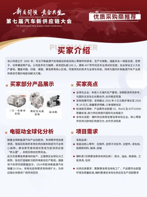 该企业将在盖世汽车第七届新供应链大会发布最新项目。寻源核心零部件与辅料供应商,覆盖压铸、定转子冲压等全链条环节,2026年采购规模预计达4亿元人民币,2028年更将冲刺20亿元采购额,为区域供应链伙伴释放重磅合作机遇。