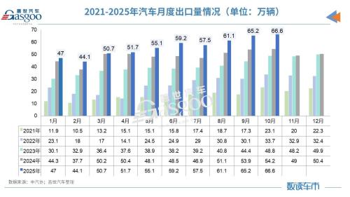 2025年10月,中国汽车出口继续保持强劲势头,单月出口量达66.6万辆,环比增长2.1%,同比增长22.9%,连续三个月稳定在60万辆以上的高位水平。1-10月累计出口量已达561.6万辆,同比增长15.7%,展现出中国汽车产业在全球市场的持续竞争力。