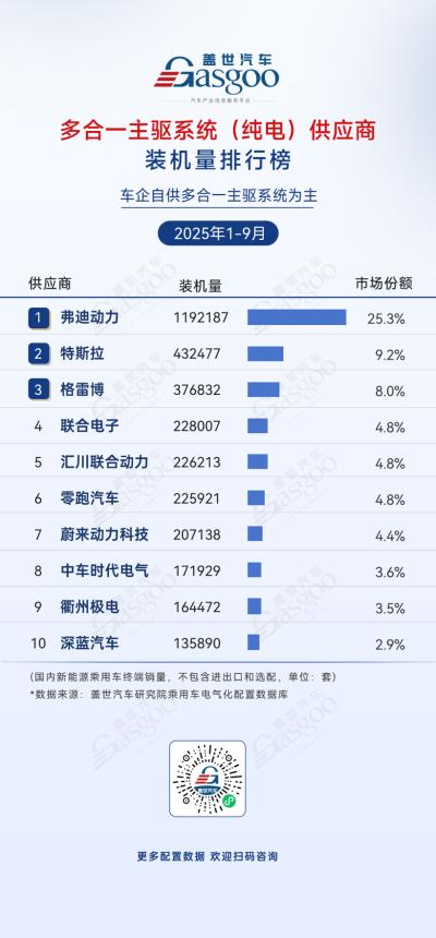 弗迪动力,2025年1-9月装机量1192187套,市场份额25.3%。
