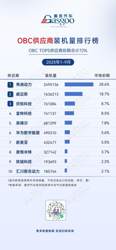 从OBC供应商装机量排行来看,市场集中度较高,弗迪动力以249.5万套装机量和28.6%的市场份额领跑,威迈斯紧随其后,凭借163.6万套装机量和18.7%的份额位居第二,两家合计占据47.3%的市场份额,形成第一梯队核心;欣锐科技、富特科技、英搏尔组成第二梯队,市场份额均在7%-9%区间,头部五家供应商合计占据63.6%的市场份额;华为数字能源(5.6%)、新美亚(5.0%)等其余五家企业市场份额均不超过6%,合计仅占36.4%。整体市场呈现“头部领跑、梯队分明”的特点,技术研发能力与规模化交付效率成为OBC供应商的核心竞争力,中小厂商需在细分领域或技术路线上寻求差异化突破以抢占市场空间。