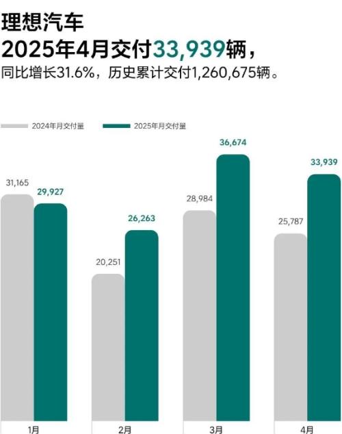 作为2023年和2024年连续两年的新势力销冠,理想汽车2025年的开局并不顺利。今年前4个月,理想累计交付12.68万辆,按原70万辆目标计算,完成率仅为18%。而4月单月交付3.39万辆,环比下降7.46%,被零跑和小鹏反超,降至至新势力品牌第三位。