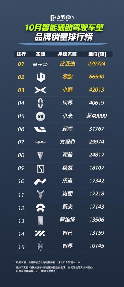 在近日发布的太平洋汽车10月智能驾驶车型品牌销量榜中,比亚迪以绝对优势位居首位,是第二名的四倍有余,领先优势显著。