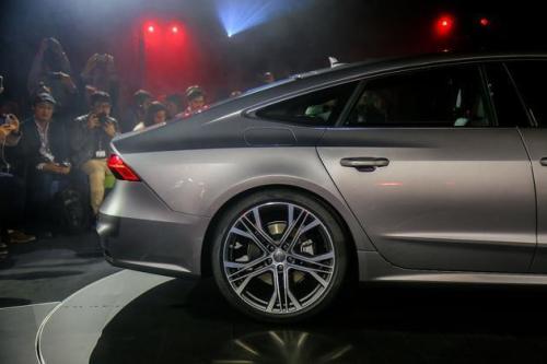 车身侧面,全新一代A7依旧沿用了上一代车型经典的溜背式设计,流线型的设计使全车运动感倍增。此外,新车的腰线从前大灯一直延伸至尾灯,配合门板处隆起的筋线进一步提升了车辆的力量感。