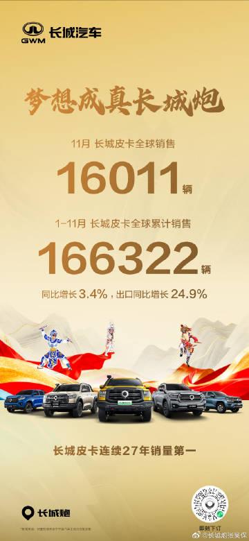 12月2日,长城汽车公布最新产销数据:1-11月,长城皮卡全球累计销售166322辆,同比增长3.4%,其中海外市场同比劲增24.9%,继续稳居中国皮卡品牌销量第一,刷新“连续27年销冠”纪录。