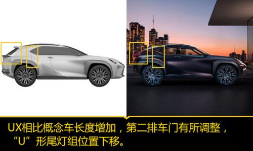新车侧面造型中,反光镜设计在前风挡玻璃上,采用两条金属合并的手法,且其中还安有摄像头。新车相比概念车长度增加,第二排车门有所更改。后翼子板处采用了外扩设计,配合短小的车尾,让整车看起来更加动感。UX所装配的21寸轮毂很显宽大,内部条辐较多。“U”形LED尾灯与概念车相比位置下移,另外后保险杠样式也小幅改动。