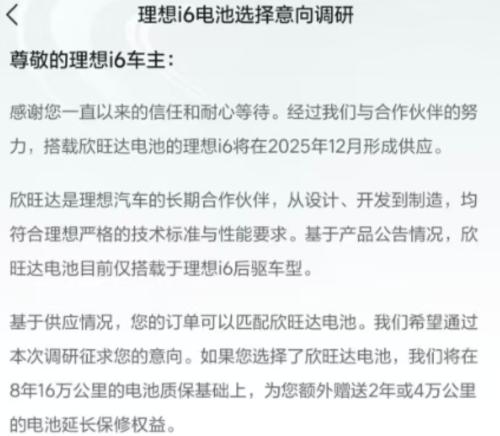 但是理想汽车并未明确表态选择欣旺达电池能可以提前提车时间。同时对于i6车型,只有两驱车型可以进行两种电池选择,而高配四驱车型只选择宁德时代电池,这让消费者更认定宁德时代电池要“高出一等”,所以多数消费者仍倾向于选择宁德时代电池。