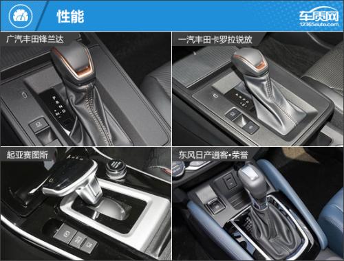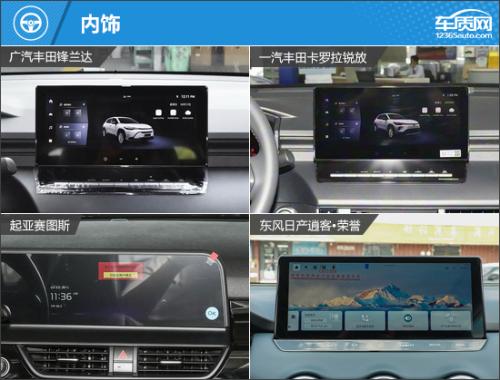内饰方面,三款日系车型采用传统式设计,起亚赛图斯虽然更注重科技感的营造,但也没有因为一味求新而忽视日常用车的便利性。其中,丰田卡罗拉锐放和丰田锋兰达因为出自同一品牌,设计相似度极高,空调控制按键集成在中控屏幕下方,整体感更强。日产逍客*荣誉采用较为扁平的12.3英寸中控屏,避免驾驶员的视线被遮挡,设计直观的空调控制面板也非常方便驾乘者进行操作。起亚赛图斯采用双10.25英寸一体式显示屏,拥有更强的科技感,综合型控制面板同样保留了常用功能实体按键。换挡形式方面,四款车型均采用机械挡把换挡。