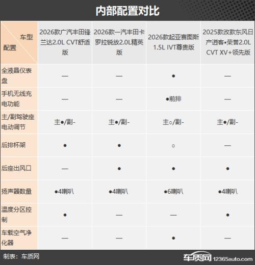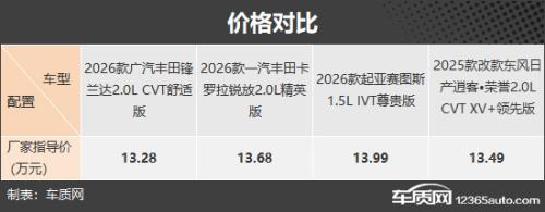 本次挑选的四款车型分别为2026款广汽丰田锋兰达2.0L CVT舒适版(以下称:丰田锋兰达)、2026款一汽丰田卡罗拉锐放2.0L精英版(以下称:丰田卡罗拉锐放)、2026款起亚赛图斯1.5L IVT尊贵版(以下称:起亚赛图斯)和2025款改款东风日产逍客*荣誉2.0L CVT XV+领先版(以下称:日产逍客*荣誉)。四款车型产品特点和市场定位基本相同,虽然厂家指导价都超过13万元,但因为终端优惠较大,实际售价都很有竞争力(由于目前图片数量较少,因此部分车型的图片并不是相对应的具体款型)。