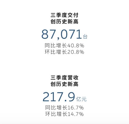 在三季度,蔚来共交付87071台车,同比增长40.8%,环比增长20.8%,创下历史新高。对应的营收为217.9亿元,同比增长16.7%,同样创下新高。