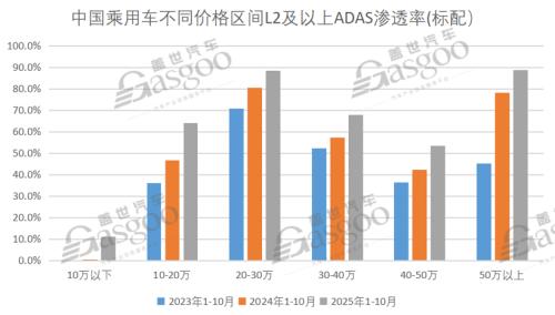 相比之下,曾经的主流L2能力正进入“过渡期”。其渗透率在2024年触顶后略有回落,用户需求正从基础辅助转向更高阶体验:不再只关注“是否具备辅助驾驶”,而是转向对能力边界、场景覆盖度及稳定性体验的综合评估。这种趋势在产品端体现得更明显:10万以下车型从几乎零配置跃升至11.0%,10–20万区间提升至64.0%,20万以上车型普遍逼近90%,高阶ADAS正逐渐成为主流车型的基础能力。高端市场同样快速补齐差距,50万以上车型的渗透率从45.3%提升至88.9%。整体来看,智能辅助驾驶正从“配置亮点”迈向“竞争门槛”,并推动市场向更智能、更体验导向的下一阶段演进。