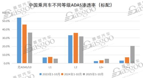 无论是高速辅助驾驶、城市NOA,还是智能泊车等特定场景功能,智能辅助驾驶技术正在持续拓展应用边界,不断提升驾驶体验。根据盖世汽车研究院数据,从2023年至2025年1–10月,中国乘用车ADAS渗透趋势正在从“有无之争”全面迈向“能力之争”。无ADAS/L0车型占比从53.9%降至36.4%,L1占比同步收缩,辅助驾驶正成为乘用车的基本配置属性。同时,更能代表先进能力的高阶功能呈现爆发式增长:L2++渗透率由3.2%跃升至20.7%,L2+占比亦实现翻倍。高速领航、城市辅助等功能的迅速普及,不仅说明用户对高阶能力的接受度显著提升,也标志着车企正将高阶ADAS作为产品竞争力的核心筹码进行布局。