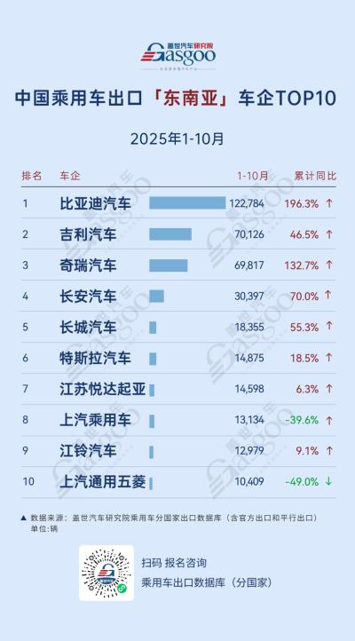 NO.1比亚迪汽车。1-10月,向东南亚出口122,784辆,累计同比增加196.3%。