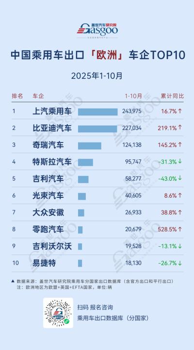 NO.1上汽乘用车。1-10月,向欧洲出口243,975辆,累计同比增加16.7%。