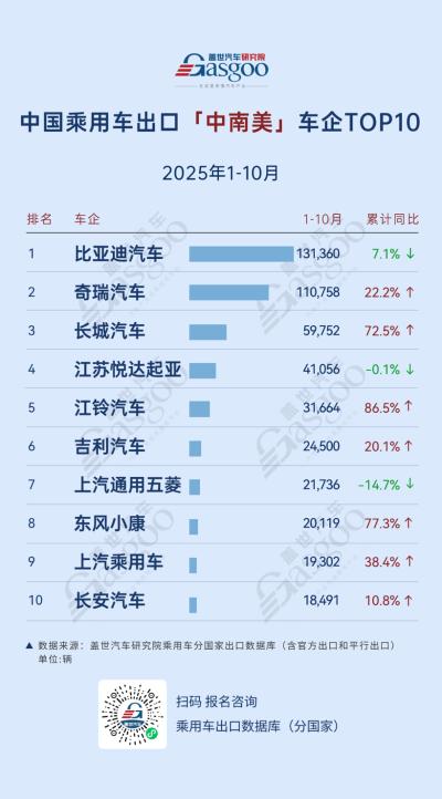 NO.2奇瑞汽车。2025年1-10月,向中南美出口110,758辆,累计同比增加22.2%。