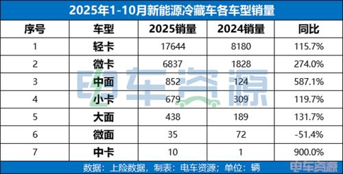 电车资源统计数据显示:2025年1-10月,新能源冷藏车累计销量26495辆,同比增长147.5%。其中,新能源轻卡冷藏车17644辆,同比增长115.7%;微卡6837辆,同比增长274%;中面853辆,同比增长587.1%。