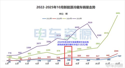 仅从数据本身来看,2025年新能源冷藏车市场可用“繁荣”来形容。这一现象的出现,自然离不开“新能源冷藏车3.5万元补贴”政策的拉动。从2022-2025年新能源冷藏车月销量数据来看,2024年以后该细分市场事实上也一直保持较高同比增速,自然增长。冷藏车补贴政策的实施及2025年政策延续,确实对于拉动新能源冷藏车销量起到了立竿见影的效果。