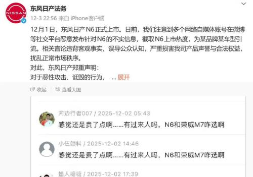 这一事件揭示了市场竞争的另一面,当合资品牌新能源车开始展现出竞争力时,它们不仅会赢得对手的尊重,也可能成为某些竞争对手试图截流的目标。据报道,此前多位博主曾吐槽该品牌车型在东风日产N6相关微博下进行评论引流。