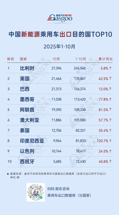 NO.1比利时,2025年1-10月,向比利时出口新能源乘用车245,540辆,10月单月出口27,396辆,累计同比增长5.8%。