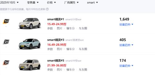 目前,除了smart #1的月销量能够稳定在2000辆上下,smart #3、#5的月销量均仅为3位数。10月,smart #3的销量仅为405辆,#5的销量也仅为174辆。