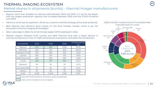 与此相对,西方传统厂商则呈现收缩或专注于高端的态势。Teledyne FLIR虽仍以22%的收入份额位居全球第二,但其出货量从2022年的72万颗降至2024年的61万颗。法国的Lynred与美国的Seek Thermal出货量也连续下滑,2024年份额分别为10%和8%。报告分析,这些厂商正更专注于高端产品并整合产业链。