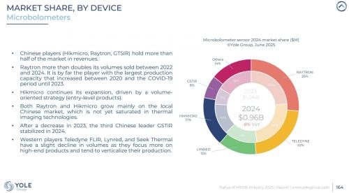 全球红外热成像探测器市场正迎来格局重塑的时刻。根据市场研究机构Yole Group近期发布的两份报告(《Status of the MEMSIndustry 2025Markets & Technology Report(2025年MEMS行业市场与技术报告)》、《Thermal lmagingand Sensing 2025Markets and Technology Report(2025年热成像和传感市场与技术报告)》,在全球热成像微测辐射热计市场,中国厂商睿创微纳在2024年实现了历史性突破,成为全球出货量与市场收入的双料冠军。